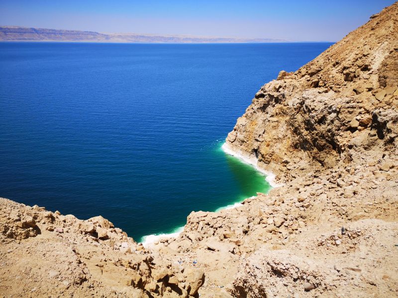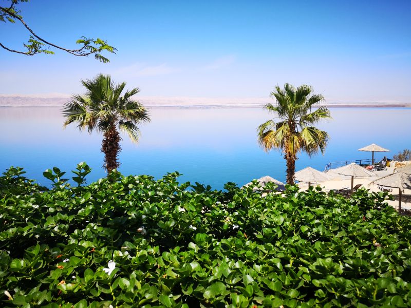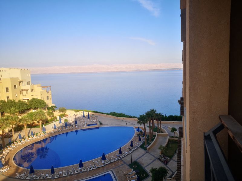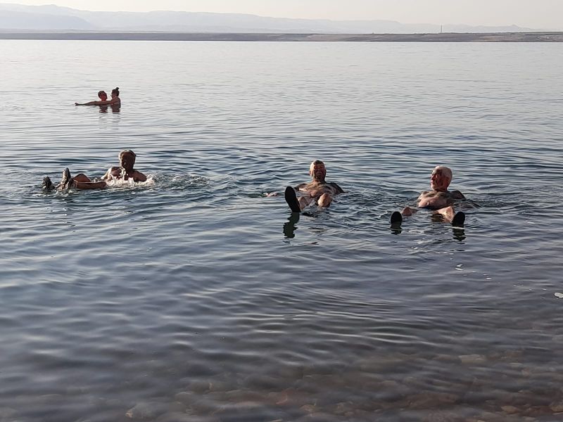 Nach unserer Rückkehr ins Resort geht es zum Baden ins Tote Meer. Das Tote Meer ist ein abflussloser See, der 440 m (im Jahr 2025) unter dem Meeresspiegel liegt. Sein Wasserstand sinkt jährlich um einen Meter. Nahezu kein Wasser kommt über den Jordan, Israel zweigt das Wasser ab. Der durchschnittliche Salzgehalt des Sees liegt bei 28 %. Der Salzgehalt der Ostsee bei Rügen ist 1%. |