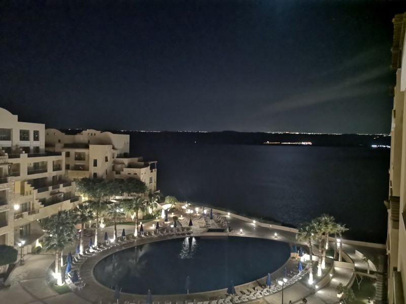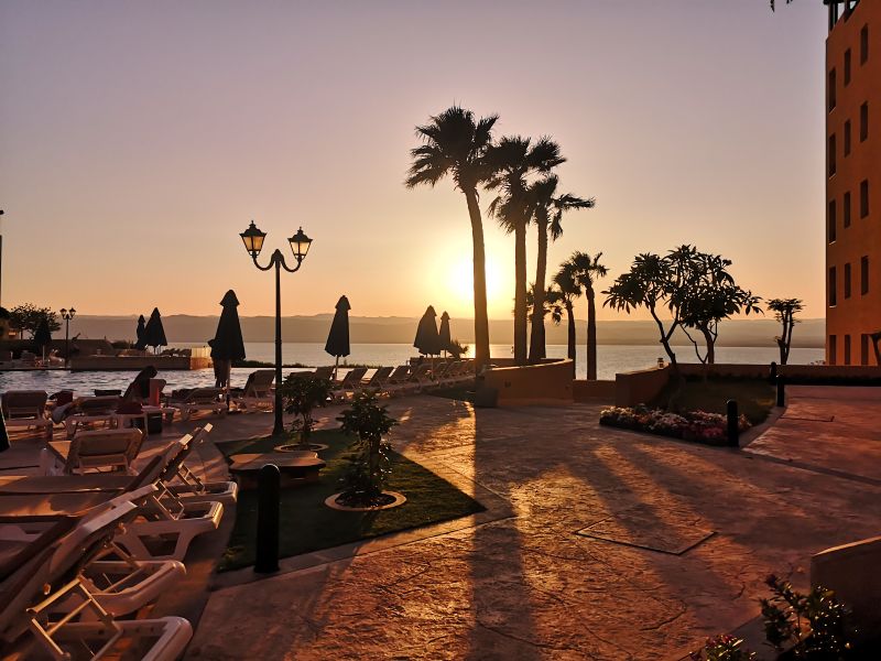 Den Abend genießen wir am Pool. Wir sehen über das Tote Meer in Richtung Israel. |