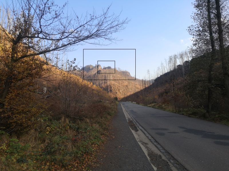 Nach 40 minütiger Fahrt erreichen wir Hřensko. Vorbei an einer Vielzahl von Verkaufsständen laufen wir durch den Ort entlang des Kamenice-Bachs. Etwa zwei Kilometer müssen wir die Landstraße nutzen. Dann sehen, besser erahnen wir unser heutiges Ziel: |