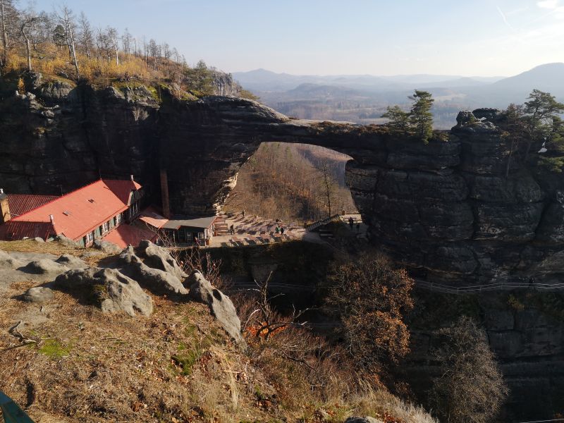 Beeindruckende Kulisse, Prebischtor und Ausflugsgaststätte Falkenhorst Das Prebischtor ist die größte natürliche Sandsteinbrücke Europas: Spannweite 26,5 Meter; Höhe 16 Meter; maximale Breite 8 Meter; Torbogenstärke 3 Meter |