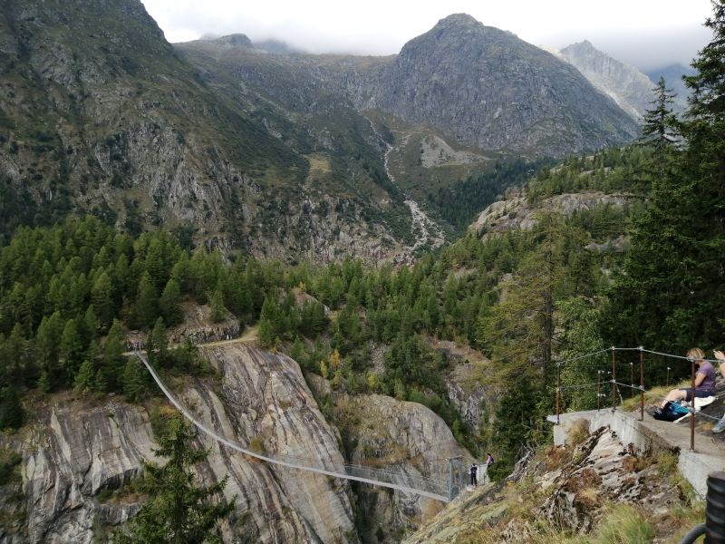 Der Blick in die Massaschlucht läßt uns die Hängebrücke erahnen. Im Hintergrund sind die Ausläufer des Aletschgletschers zu sehen. |