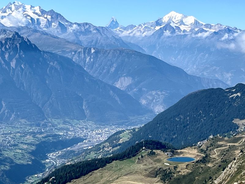 Blick ins Rhonetal mit der Kleinstadt Brig, im Hintergrund das Matterhorn, rechts davon das 4505 m hohe Weißhorn. |
