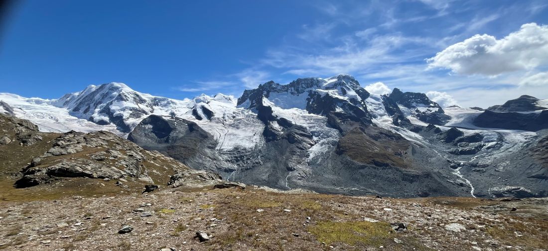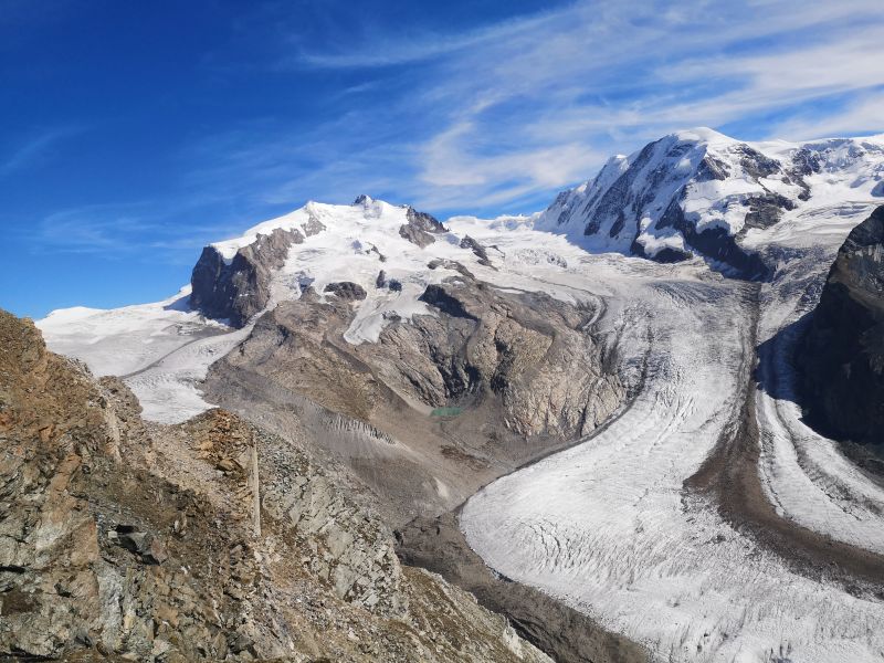 Links ist der Gornergletscher, mittig der Grenzgletscher, dazwischen die Dufourspitze, die mit 4634 m ü. M. der höchsten Punkt der Schweiz und auch des gesamten deutschen Sprachraums ist. Bei meinem ersten Besuch an dieser Stelle elf Jahre zuvor floß der Gornergletscher noch in den Grenzgletscher. |
